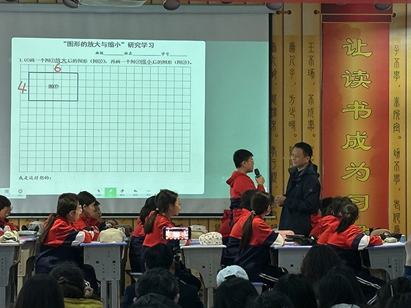 活动包含课堂展示、交流讲座与工作室内部活动。首先,贲友林老师带来《图形的放大与缩小》示范观摩课,贲友林老师始终坚持“以学生为主体”,设计观察、操作、对比等活动,鼓励学生大胆表达、动手探究,发现 “形状不变、大小变化” 的本质规律,在实践中建构空间认知,发展几何直观与推理能力。接着,受降路小学王宁彩老师执教《长方形和正方形的认识》,通过“折一折、量一量、比一比”等动手操作环节,引导学生自主发现长方形与正方形的特征,让知识在实践中自然生成,落实“做中学”理念。 研讨课结束,贲友林老师与在场教师互动答疑,结合课例细致讲解每一个教学环节的设计意图,帮助教师明晰课堂逻辑、把握教学关键,有效解决一线教学中的实际困惑。他以《让学生学会思考:AI时代的小学数学教学》为题做专题讲座。贲友林指出,AI时代的小学数学更应回归教育本质——让学生会思考、能思考、爱思考,让思考真实发生,让学生在探究中理解、在思辨中成长。 工作室内部围绕“小研究设计”展开深度研讨,聚焦“如何让小研究更贴近学生、更具探究性”。贲友林强调,小研究应突出问题简约、任务明确、操作可行、思考真实,引导学生在课前预习、课中探究、课后反思中完整经历数学思考过程,实现从“学会”到“会学”的转变。研讨中,贲友林还针对日常教学难点、小研究设计、课堂组织等一线实际问题逐一细致解答,有效破解教师教学痛点、拓宽教学思路,为常态课堂提质提供了具体可行的实践指导。 本次活动为老师们提供了高质量的课例示范,也为新课标下小学数学教学提供了可以借鉴的实践范式。受降路小学将继续以研促教、以教促学,在“学为中心”的道路上笃行不怠,让每一节常态课都成为提质增效的主阵地。 |